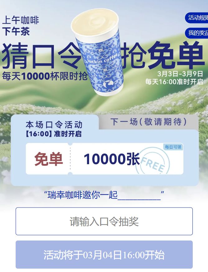 (2)活动形式:活动期间,用户可通过瑞幸咖啡APP/微信小程序进入猜口令活动页面参与猜口令输入正确口令后,可参与抢鲜萃轻乳茶免单券(0元兑换券)活动。