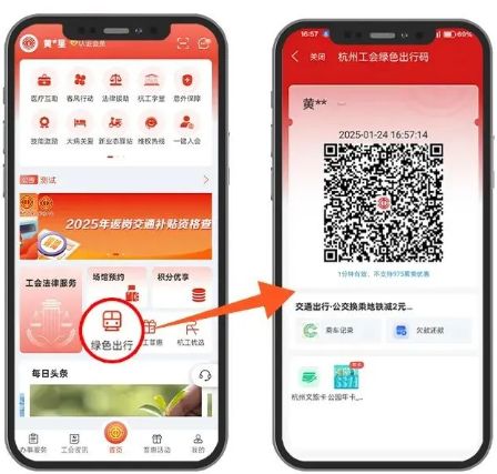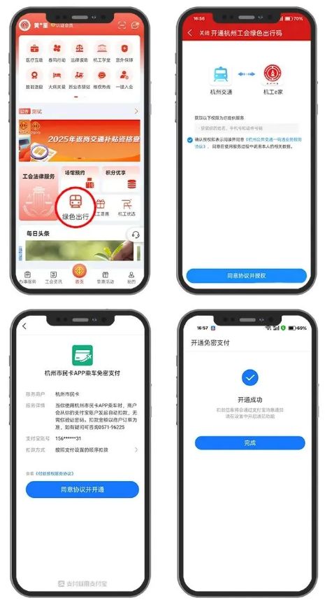 点击“杭工e家“APP首页“绿色出行”,同意授权完成工会乘车码功能及支付宝免密代扣功能开通。