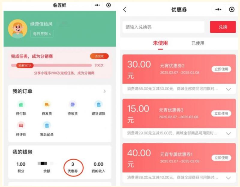 在微信搜“临匠鲜”小程序首页-【领券中心】进行领取,消费券将实时入账。