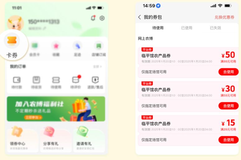 登录网上农博APP或小程序,进入【临平馆】点击领取农产品消费券