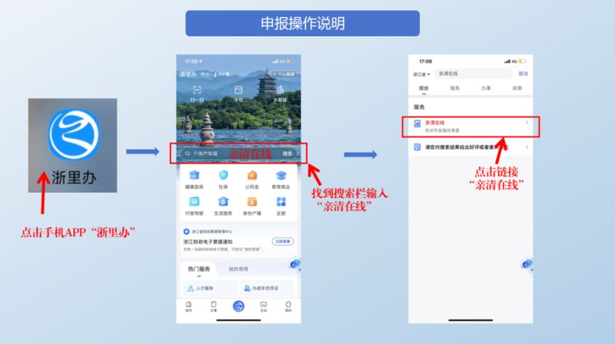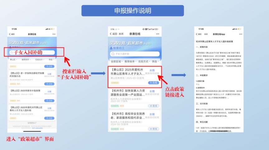 申报人可通过手机APP“浙里办”进入申请通道:打开“浙里办”搜索栏输入“亲清在线”进入政策界面搜索“入园补助”点击“杭州市萧山区青年人才子女入园补助政策”即可进入兑付页面(详细操作请参照操作说明)。